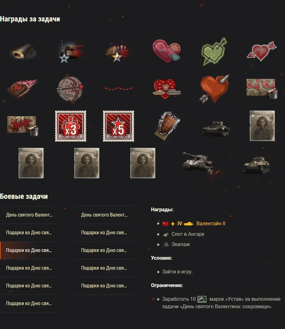С 13 по 20 февраля вас ждут невероятные подарки! Выполните задачу «Случайная награда святого Валентина» (или «Случайная награда СВ») и получите случайные призы! Это могут быть личные резервы, боевые задачи на ×3/×5 опыта, 2D-стили ко Дню святого Валентина и другие элементы внешнего вида. Пройдите цепочку задач «Подарки ко Дню святого Валентина» и заработайте ещё более ценные награды, включая IV Валентайн II, V Ram II, 2D-стиль «Машина любви» и 3D-стиль «Анхальтский лев» для VIII Löwe.