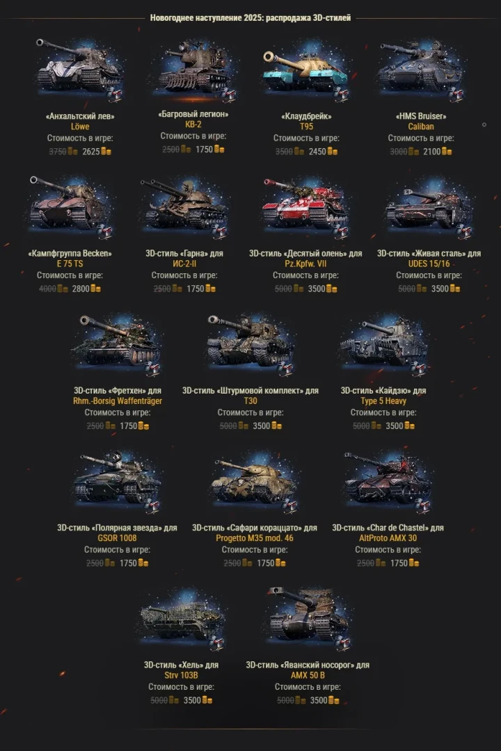 Праздники — отличный повод украсить не только ёлку, но и технику! На время «Новогоднего наступления 2025» вернутся некоторые из самых ярких 3D-стилей. Они будут доступны в игре за золото до 13 января 2025 года. Эти элементы внешнего вида сделают ваши машины уникальными и выделят их на поле боя.