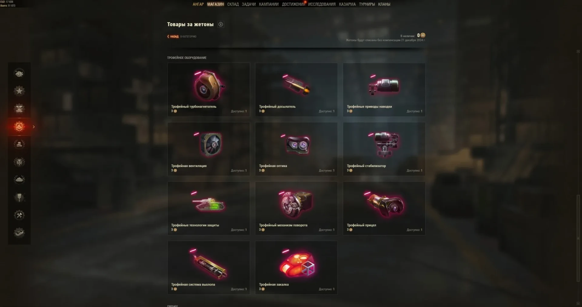 - За 3 жетона Боевого пропуска можно получить одно трофейное оборудование на свой выбор в разделе «Товары за жетоны» во внутриигровом Магазине. Только 1 раз за сезон. Такая опция не накапливается и не переходит в след. сезон БП!
