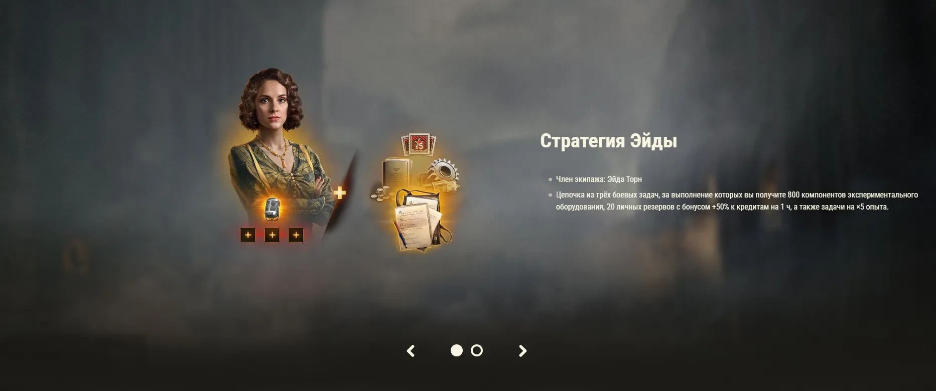 - Цепочка из трёх боевых задач, за выполнение которых вы получите 800 компонентов экспериментального оборудования, 20 личных резервов с бонусом +50% к кредитам на 1 ч, а также задачи на ×5 опыта.