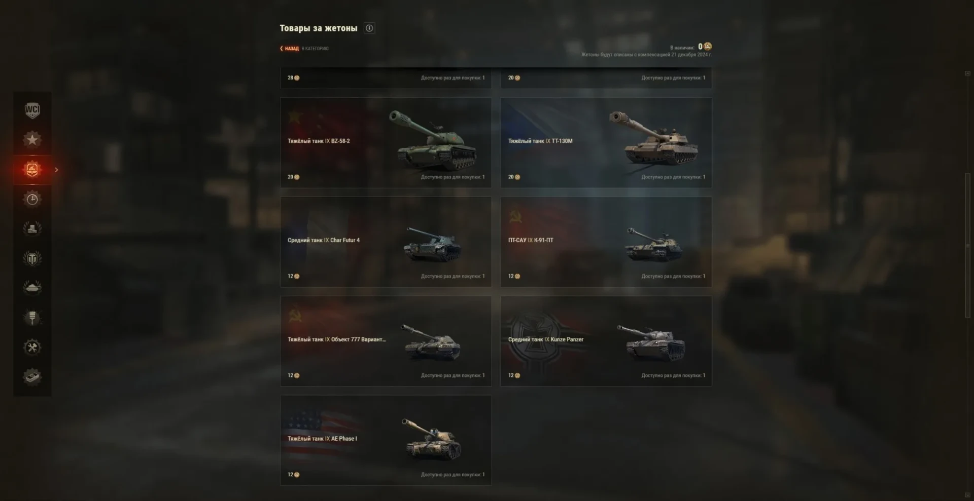 • Товары за жетоны (танки) будут обновлены в новом году. Обновление стоит ожидать в 16 сезоне 2025 г. (16-18 сезоны БП)