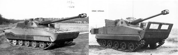 A project for an amphibious armored reconnaissance vehicle (French: engin de reconnaissance amphibie de combat) from the early 1960s. A working prototype was built in 1963. The vehicle had a low weight together with significant firepower, and it could ford wet gaps. Its advantages included fairly high crossing capacity over mud and snow, while its aluminum alloy hull offered better protection than most amphibious vehicles had at that time. In spite of positive results from trials, the ERAC 105 Proto did not enter service due to economic reasons.