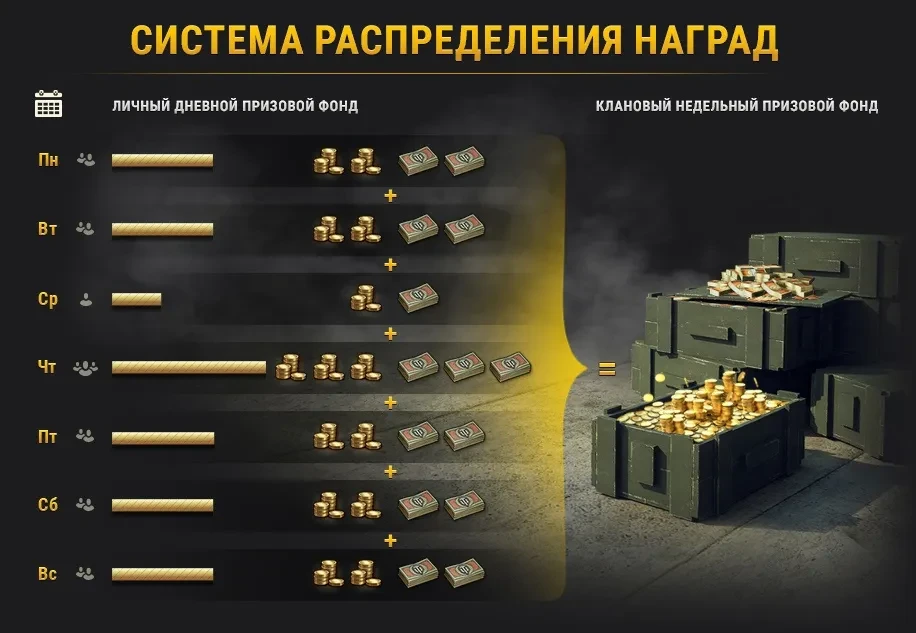 - Общий призовой фонд: сумма золота и бон, которая будет распределена между кланами, равна сумме золота и бон, полученных игроками за попадание в личный рейтинг игроков за неделю.