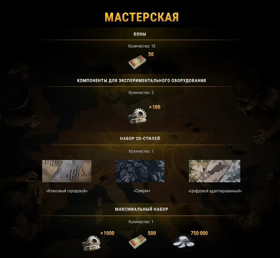 В Мастерской игроки смогут собирать различные награды из ресурсов, получаемых в сражениях на Глобальной карте.