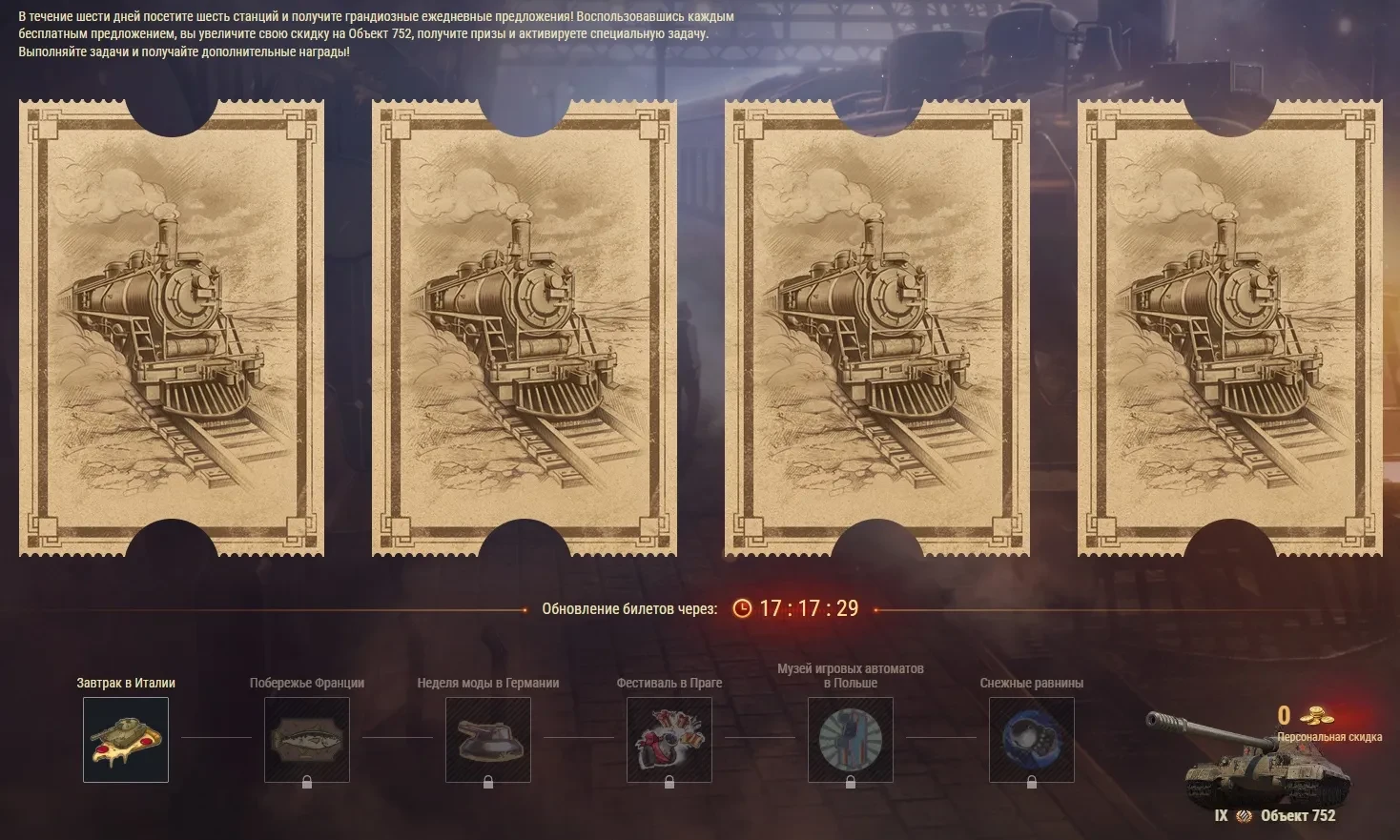 В течение 6 дней посетите 6 станций и получите грандиозные ежедневные предложения! Воспользовавшись каждым бесплатным предложением, вы увеличите свою скидку на Объект 752, получите призы и активируете специальную задачу. Выполняйте задачи и получайте дополнительные награды!