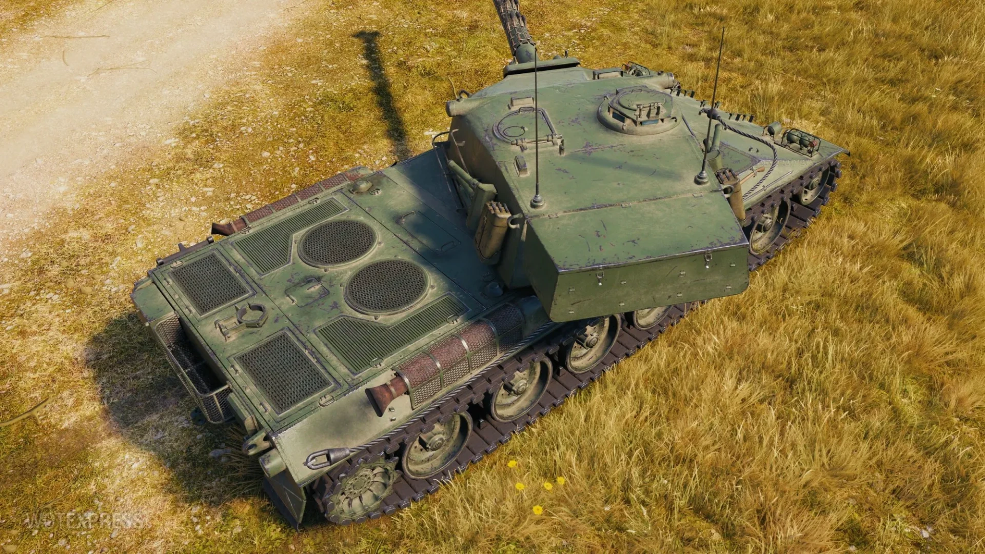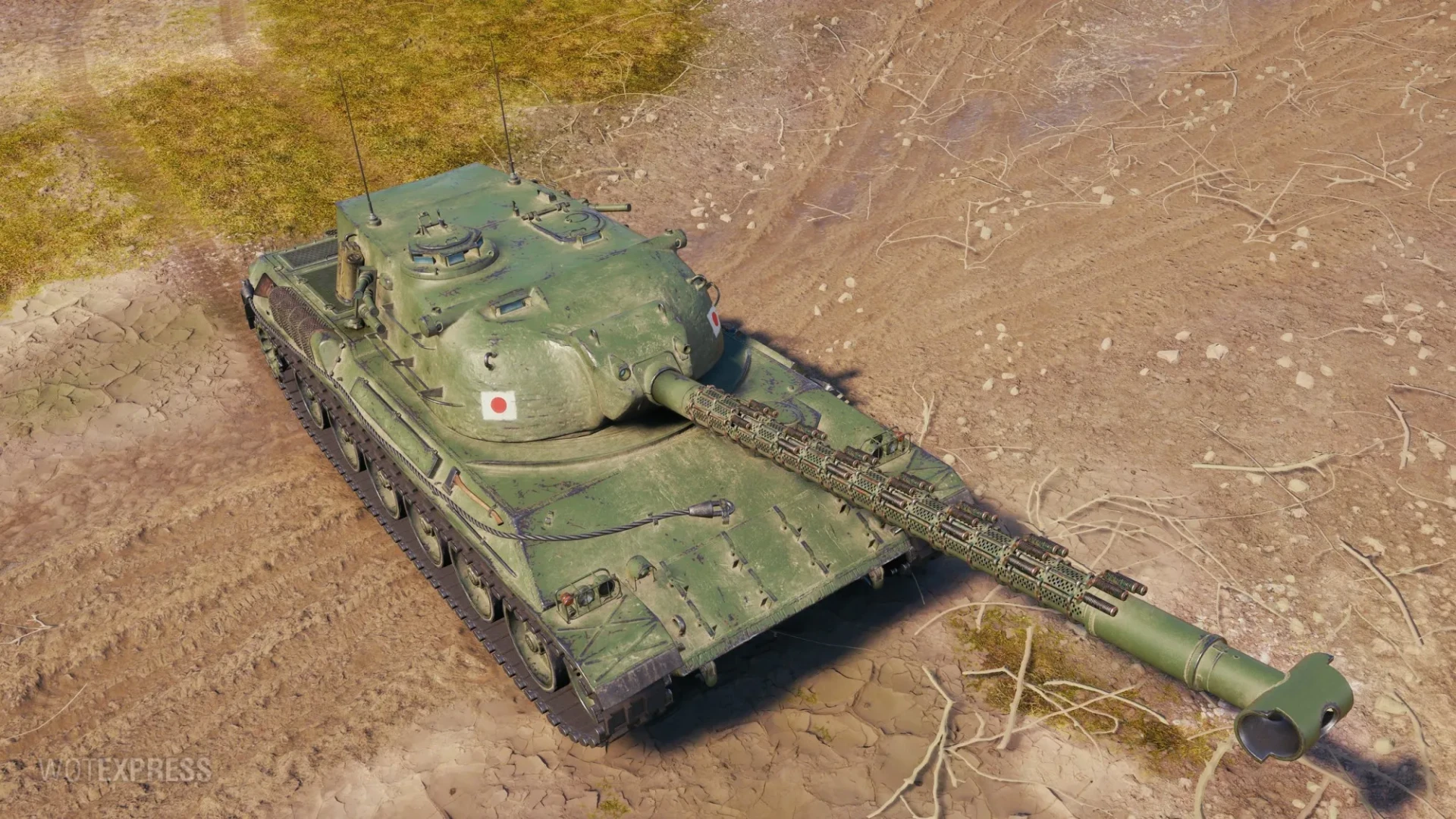 Type 68 (Япония, ТТ-9, прокачиваемый, механики: автоматическая гидропневматическая подвеска, охлаждение орудия) гуляет на природе.
