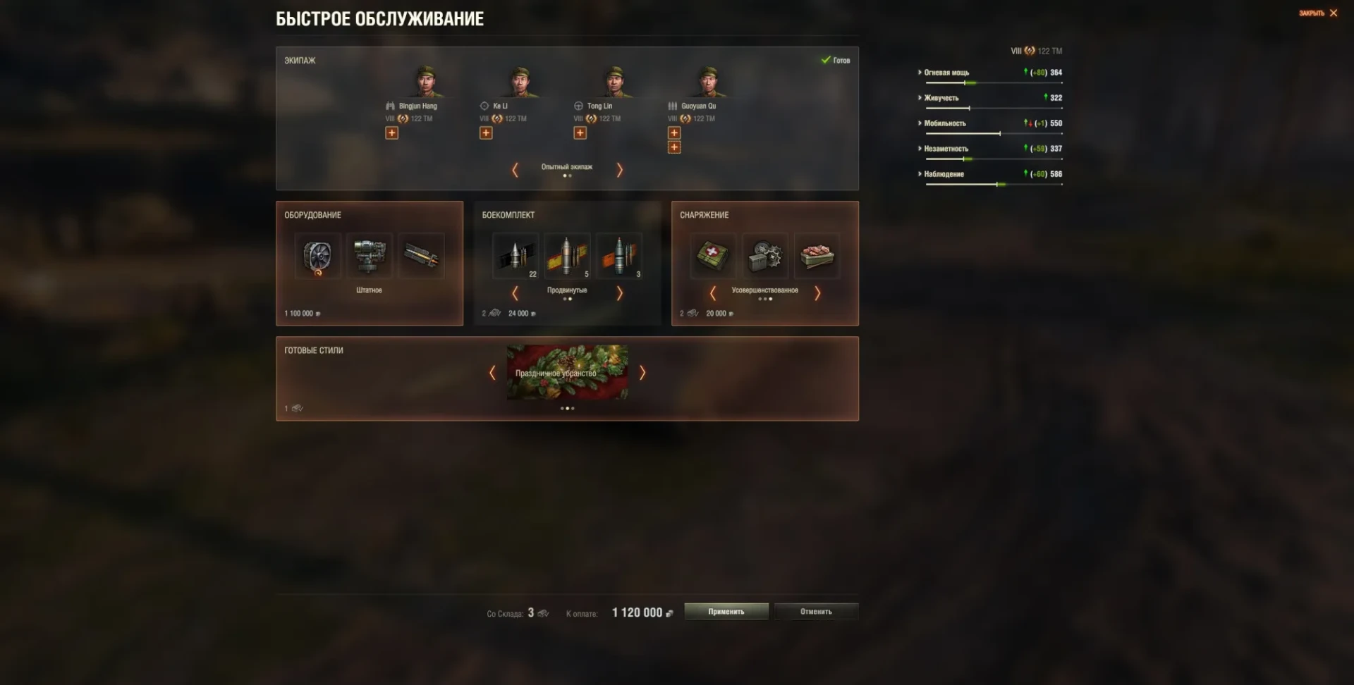 - В игру добавлена новая механика — быстрое обслуживание. Она позволяет оперативно добавить в выбранную машину предлагаемый экипаж, оборудование, снаряжение, элементы внешнего вида и боеприпасы. Оборудование предлагается на основе данных о предпочтениях игрока.