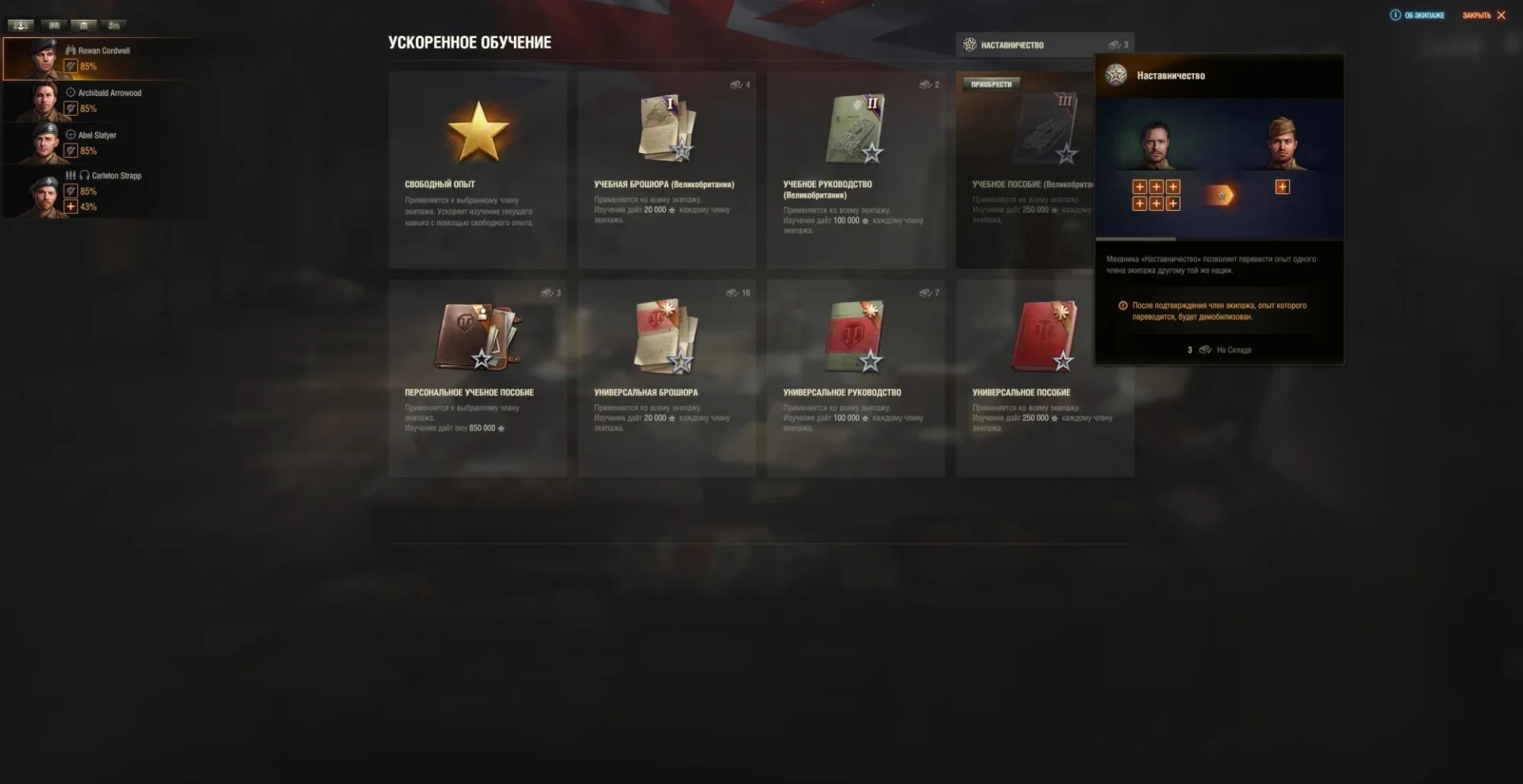 Покупать и использовать учебные материалы будет проще. Теперь для быстрого выбора количества учебных материалов, которые необходимо купить или применить, игроки могут использовать колесо мыши. Кроме того, стандартизировано контекстное меню для членов экипажа: теперь доступен одинаковый набор команд как в Ангаре, так и в окне ускоренного обучения.