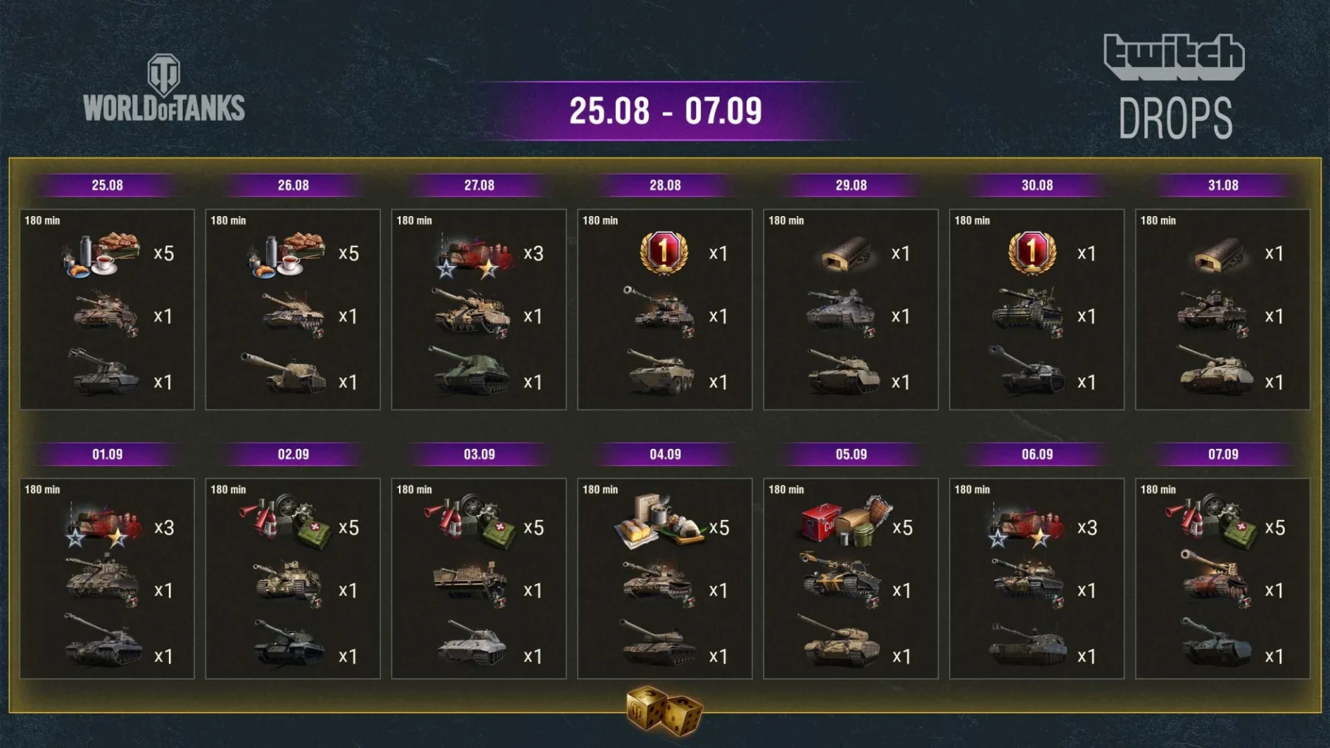 На пути к обновлению 2.0 вас ждёт две недели ценных наград Twitch Drops — с 25 августа по 7 сентября! Заходите на официальный Twitch-канал и каналы своих любимых стримеров в период перед началом новой эры World of Tanks и получайте гарантированные и секретные Drops!