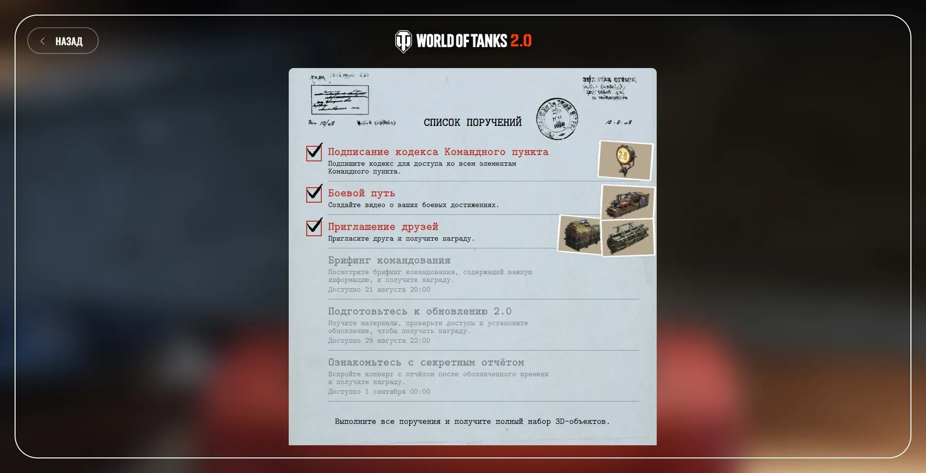 * Командный пункт будет доступен до 20 октября 12:00 (UTC+3). А видео будет доступно в течении 30 дней. Награды же начислят через 10 дней после выхода обновления 2.0.
