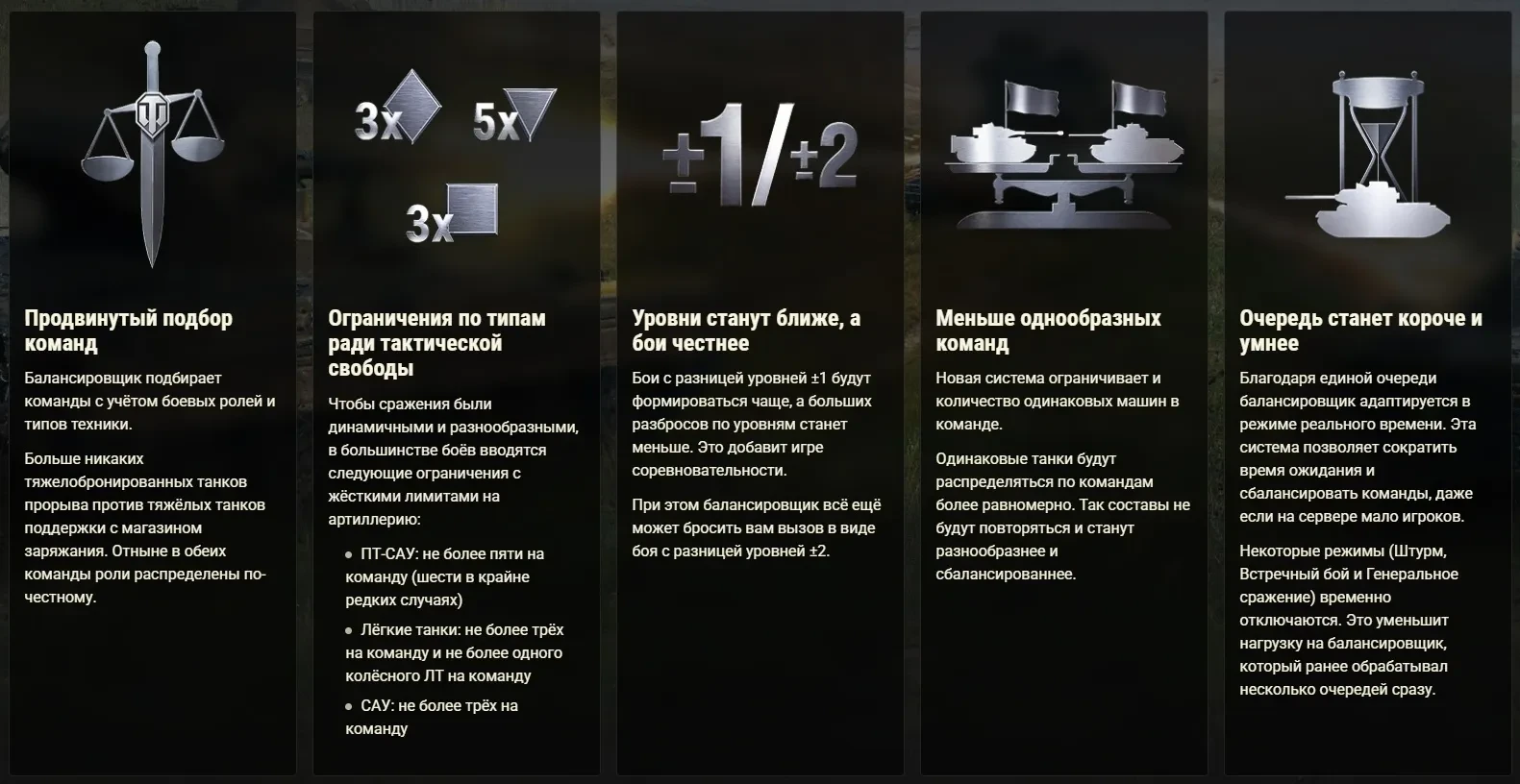 Мы понимаем, что перемены могут вызывать тревогу, особенно у ветеранов игры. Забавные и необычные составы — например, только с ПТ-САУ или с большим разбросом уровней — будут встречаться реже, но так и задумано. Главная цель новой системы — добиться более честной и приятной игры. Однако мы не стоим на месте. Мы продолжим внимательно анализировать обратную связь от игроков и проверять данные, чтобы при необходимости внести изменения.