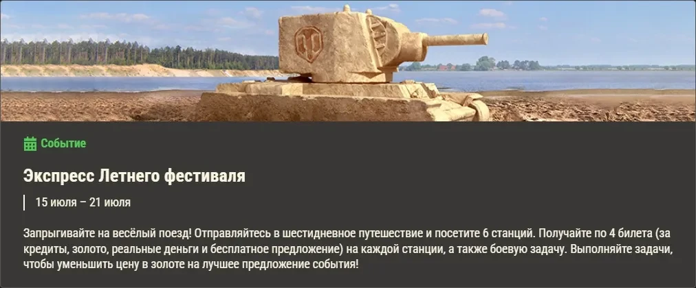 Запрыгивайте на весёлый поезд! Отправляйтесь в шестидневное путешествие и посетите 6 станций. Получайте по 4 билета (за кредиты, золото, реальные деньги и бесплатное предложение) на каждой станции, а также боевую задачу. Выполняйте задачи, чтобы уменьшить цену в золоте на лучшее предложение события!