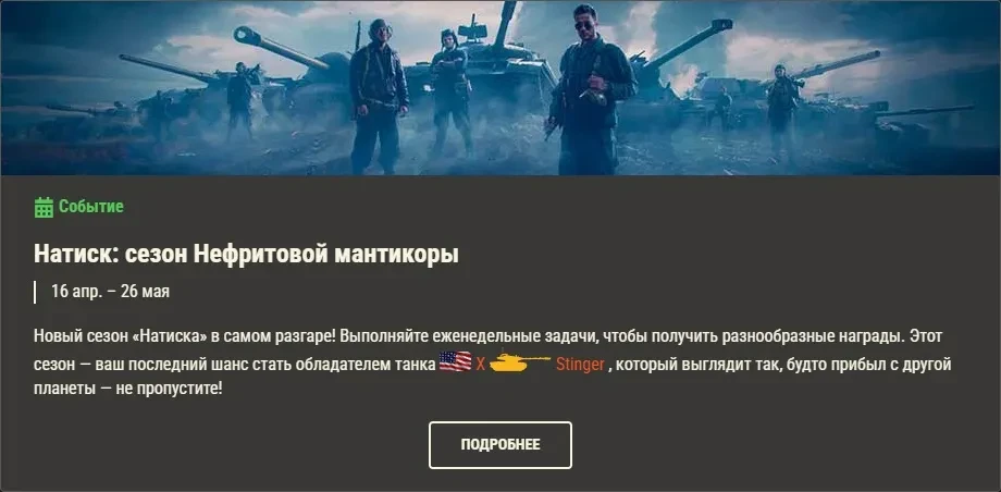 Новый сезон «Натиска» в самом разгаре! Выполняйте еженедельные задачи, чтобы получить разнообразные награды. Этот сезон — ваш последний шанс стать обладателем танка X Stinger, который выглядит так, будто прибыл с другой планеты — не пропустите!