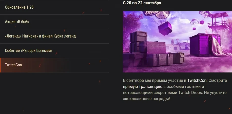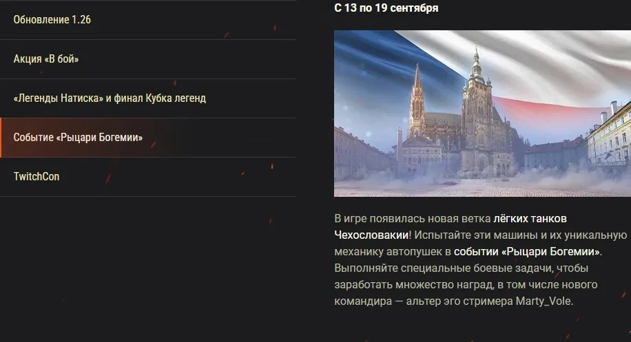 Лето на исходе, но в World of Tanks по-прежнему жарко! У нас есть новая ветка лёгких танков Чехословакии, специальные прямые трансляции TwitchCon с Twitch Drops, новые турниры по «Натиску» и масштабное обновление игры 1.26. Кроме того, в сентябре мы обновим внешний вид портала. В частности, на главной странице появится календарь событий, в котором можно будет просматривать активности текущей недели и всегда оставаться в курсе событий. Следите за новостями на портале, чтобы узнать об остальных сюрпризах сентября.