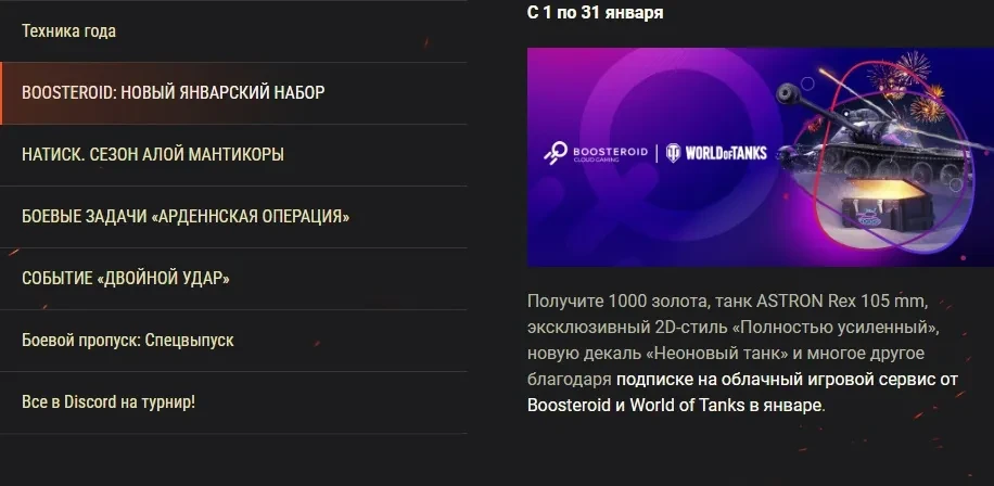 Получите 1000 золота, танк ASTRON Rex 105 mm, эксклюзивный 2D-стиль «Полностью усиленный», новую декаль «Неоновый танк» и многое другое благодаря подписке на облачный игровой сервис от Boosteroid и World of Tanks в январе.