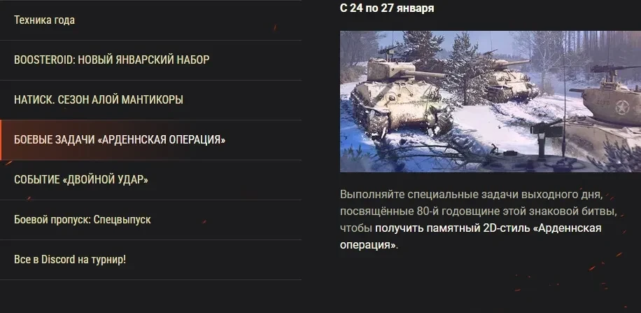 Выполняйте специальные задачи выходного дня, посвящённые 80-й годовщине этой знаковой битвы, чтобы получить памятный 2D-стиль «Арденнская операция».