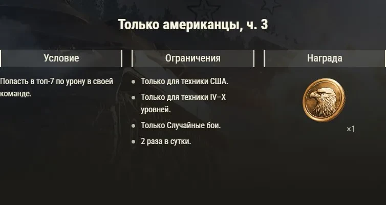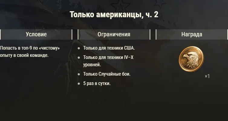 Играйте и зарабатывайте жетоны «Орёл», снаряжение, облики экипажа, элементы внешнего вида и дни Танкового премиум аккаунта, выполняя задачи для техники всех наций. Вы сможете заработать больше жетонов «Орёл», выполняя дополнительные задачи, доступные только для техники США.
