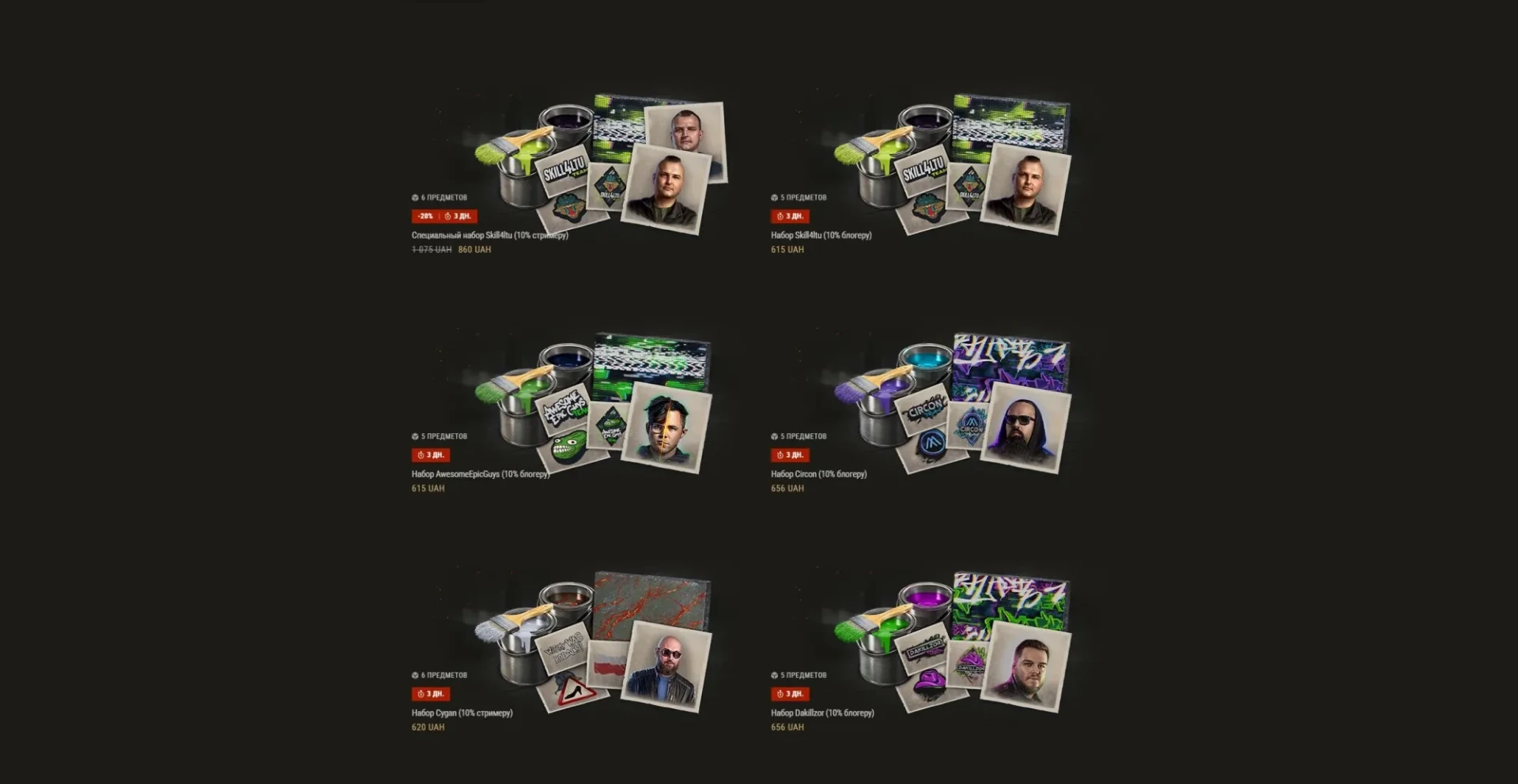 В каждом наборе вы найдёте командира-стримера с собственной озвучкой и «нулевым» навыком «Боевое Братство», а также достаточным количеством опыта для изучения ещё двух навыков. Также вы получите связанные с этим стримером эмблемы, декали, надписи и шикарный 2D-стиль.