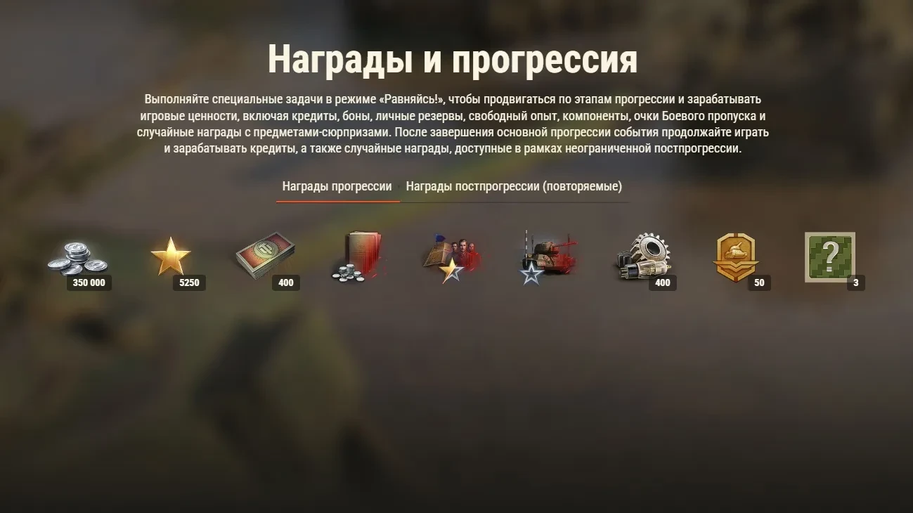 Выполняйте специальные задачи в режиме «Равняйсь!», чтобы продвигаться по этапам прогрессии и зарабатывать игровые ценности, включая кредиты, боны, личные резервы, свободный опыт, компоненты, очки Боевого пропуска и случайные награды с предметами-сюрпризами. После завершения основной прогрессии события продолжайте играть и зарабатывать кредиты, а также случайные награды, доступные в рамках неограниченной постпрогрессии.