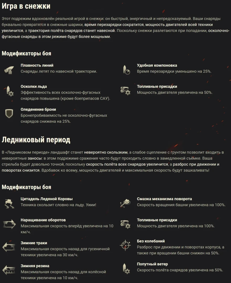 Оба подрежима предназначены для игры на технике VIII или X уровня. Это одноуровневые сражения в формате 15 на 15 на шести заснеженных картах с изменёнными механиками. В подрежиме «Игра в снежки» ваши снаряды станут похожи на комки снега и будут лететь по особой траектории. В свою очередь в «Ледниковом периоде» необходимо целиться поточнее, поскольку технику будет сильно заносить на невероятно скользкой поверхности!