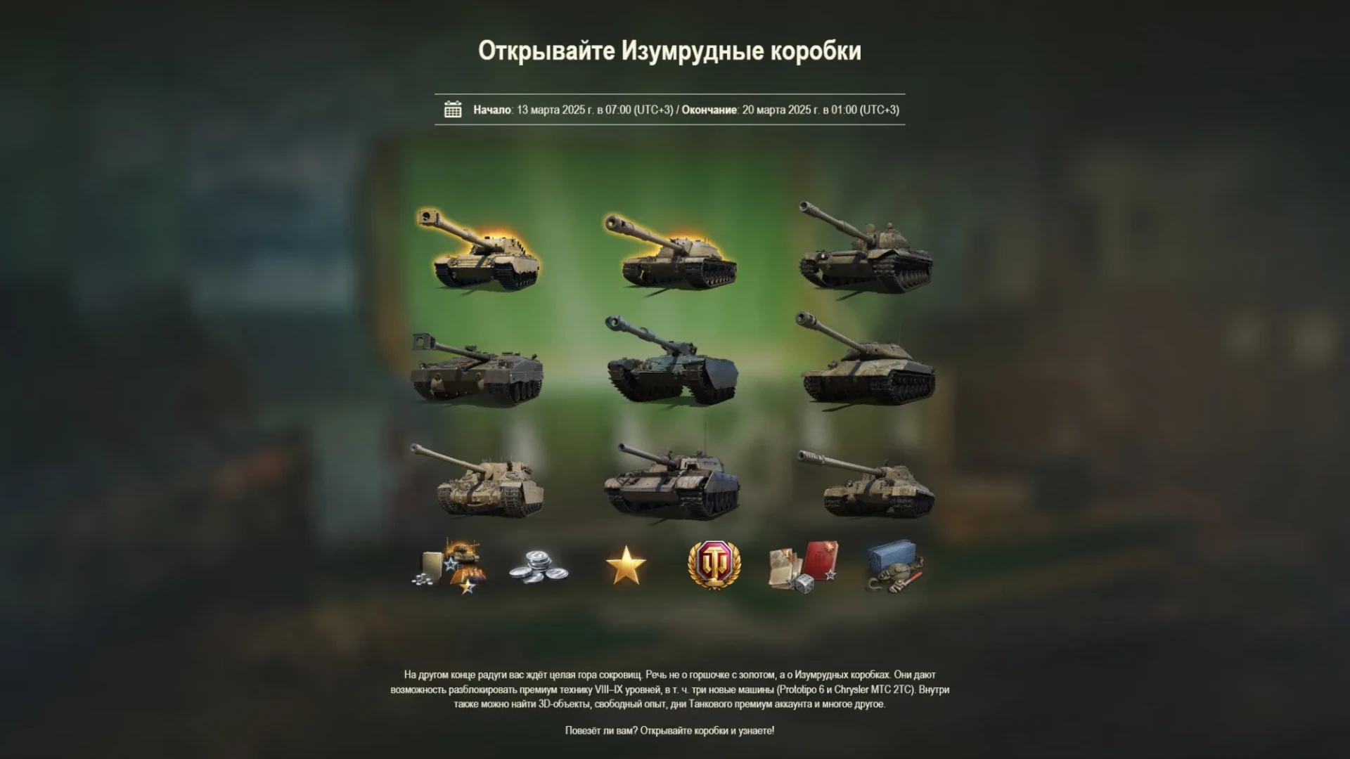 На этот раз в ящики добавили премиум танк: Chrysler MTC 2TC (США, СТ-8, прем). Вместе со всей той же техникой из коробок, что и на всех остальных регионах игры.