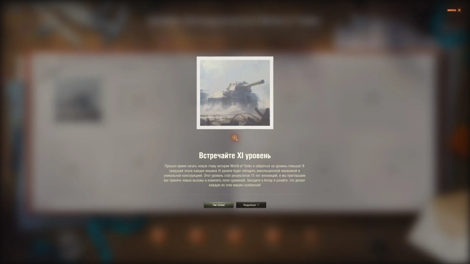 Пришло время начать новую главу истории World of Tanks и забраться на уровень повыше! В грядущей эпохе каждая машина XI уровня будет обладать революционной механикой и уникальной конструкцией. Этот уровень стал результатом 15 лет инноваций, и мы приглашаем вас принять новые вызовы и изменить поля сражений. Заходите в Ангар и узнайте, что делает каждую из этих машин особенной!