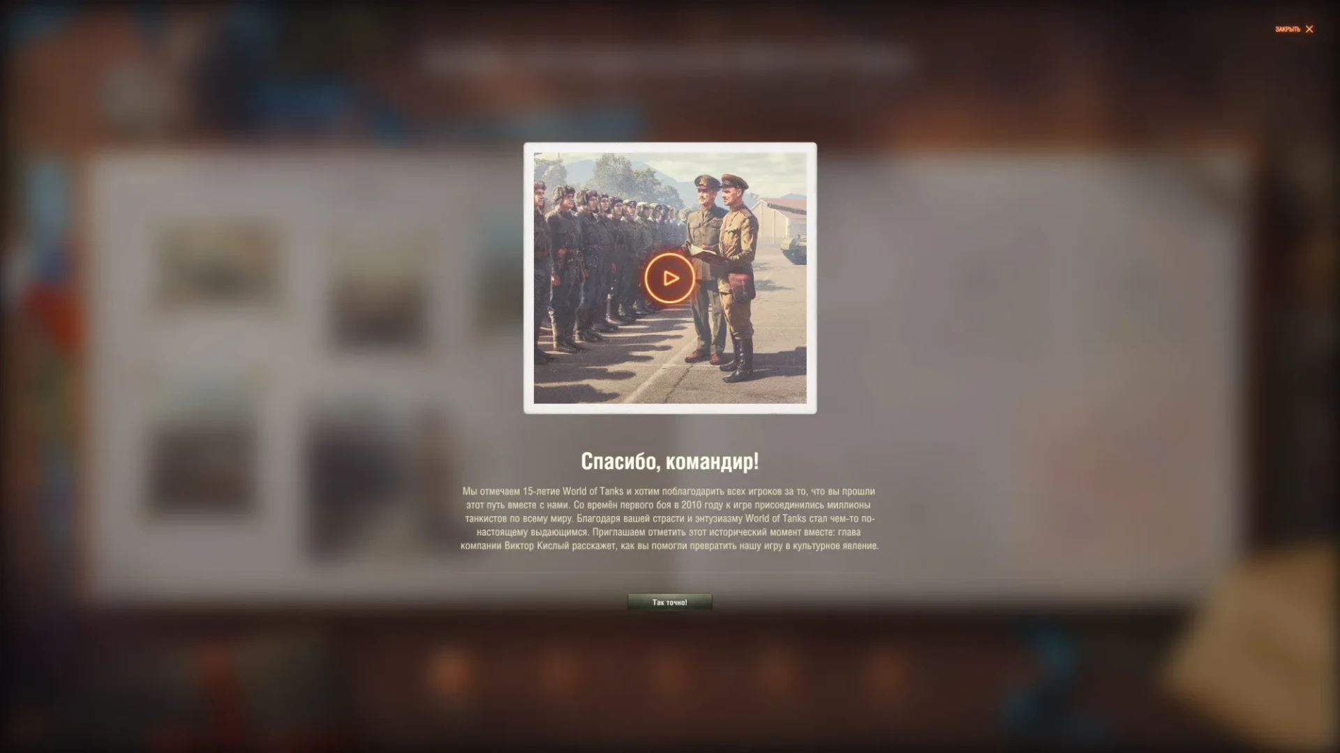 Мы отмечаем 15-летие World of Tanks и хотим поблагодарить всех игроков за то, что вы прошли этот путь вместе с нами. Со времён первого боя в 2010 году к игре присоединились миллионы танкистов по всему миру. Благодаря вашей страсти и энтузиазму World of Tanks стал чем-то по-настоящему выдающимся. Приглашаем отметить этот исторический момент вместе: глава компании Виктор Кислый расскажет, как вы помогли превратить нашу игру в культурное явление.
