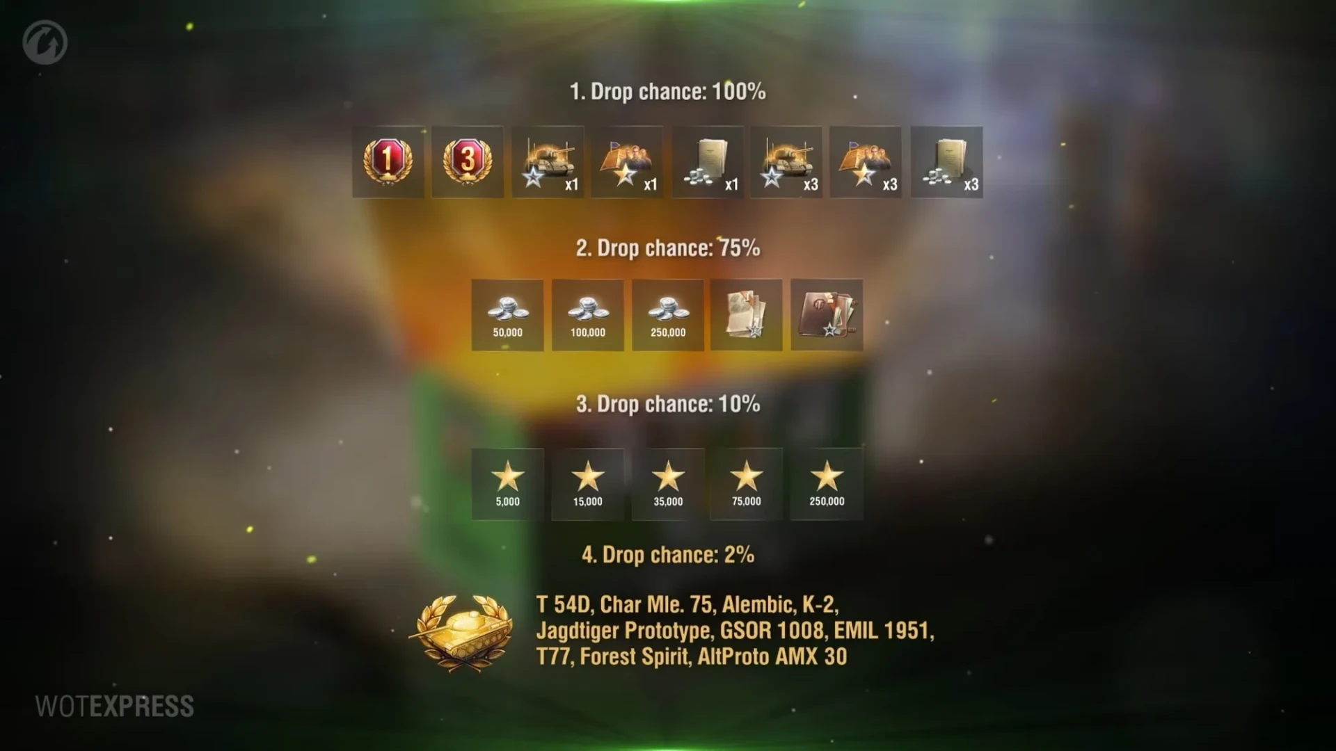 Шанс дропа прем танка: 2%. Гарант стандартный: 50 коробок.