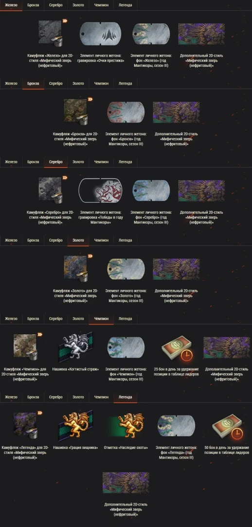 В конце года Мантикоры вы получите до четырёх версий 3D-стиля для танка Stinger — Серебряный, Золотой, Чемпионский или Легендарный — в зависимости от количества собранных знамён. Стили более низкого уровня также будут доступны. После их открытия вы сможете свободно переключаться между ними в любое время, хоть после каждого боя.