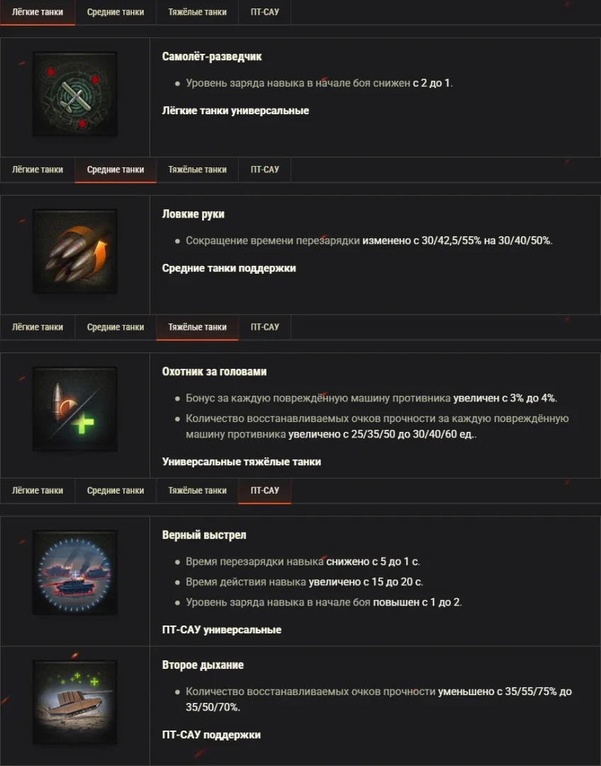 - Сокращение времени перезарядки изменено с 30/42,5/55% на 30/40/50%.