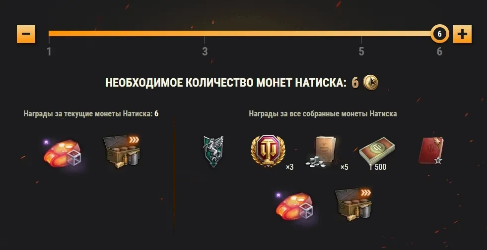 В режиме доступны еженедельные задачи на получение монет «Натиска», которые необходимо выполнять последовательно и только в этом игровом режиме. За выполнение каждой из задач вы будете получать игровые ценности, такие как дни Танкового премиум аккаунта, боны или кредиты. Кроме того, за выполнение недельной серии из пяти задач вы получите монету «Натиска». Каждая дополнительная монета «Натиска» автоматически принесёт вам новую награду.