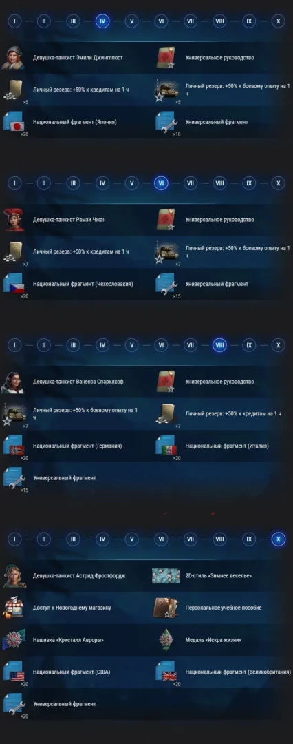 За каждый достигнутый уровень вы получаете награды: от нового праздничного 2D-стиля и особых членов экипажа до личных резервов, национальных и универсальных фрагментов и т. п.