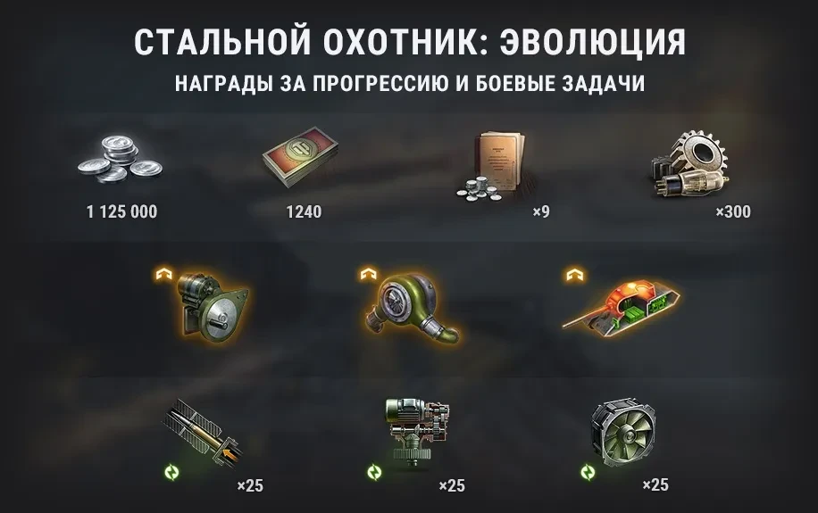 Для прохождения этапов прогрессии необходимы очки, которые можно заработать в боях режима «Стальной охотник: Эволюция» и за выполнение специальных боевых задач в нём. В зависимости от вашей результативности в боях вы также сможете заработать кредиты, очки Боевого пропуска и стальные печати, которые можно обменять на элементы внешнего вида.
