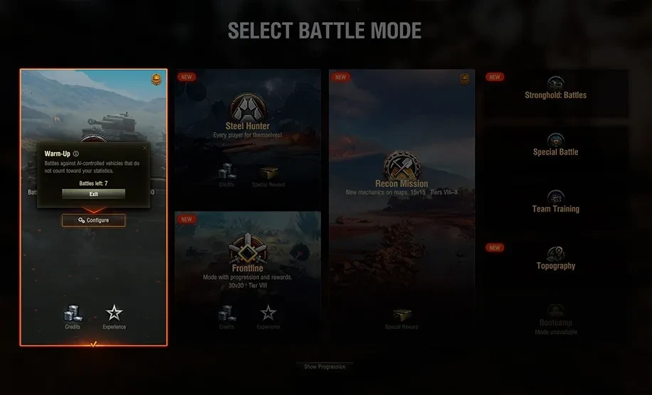 - Выполняйте обычные ежедневные, бонусные, а также премиум задачи в Случайных боях (включая Генеральное сражение) и режиме «Разминка». Выполнение каждой задачи принесёт вам одно очко, которое пойдёт в зачёт прогрессии.