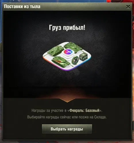 Чтобы посмотреть и забрать бонусы подписки на выбор, в игровом клиенте по пути: «Склад» ==> «Поставки из тыла» (слева, самый последний раздел с парашютом) ==> Февраль: Базовый ==> Сделать выбор 3 из 8 вещи.
