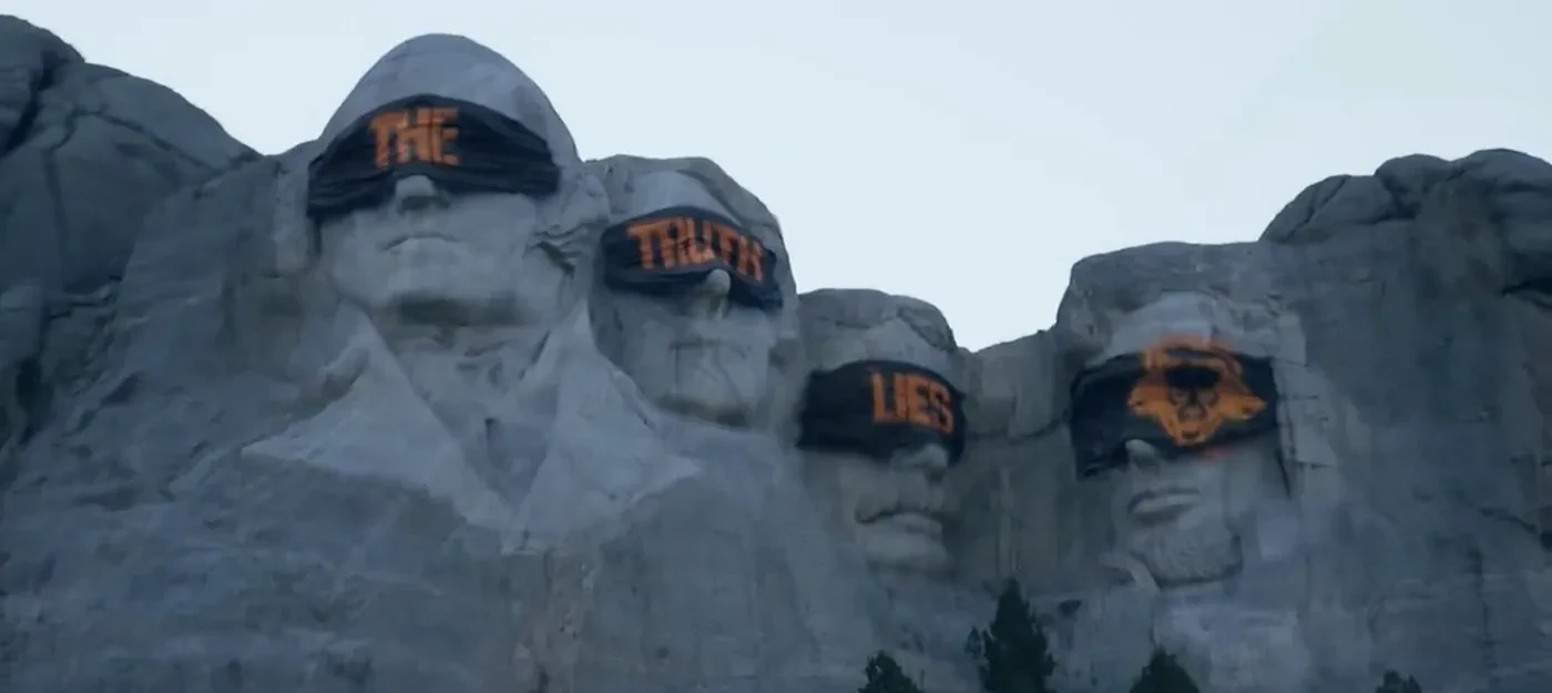 Видео показывает группу людей, прибывающих к горе Рашмор и накрывающих барельеф с портретами четырех президентов США тканью с надписью "The Truth Lies" (Истина скрыта). Фирменный стиль Treyarch легко узнаваем.