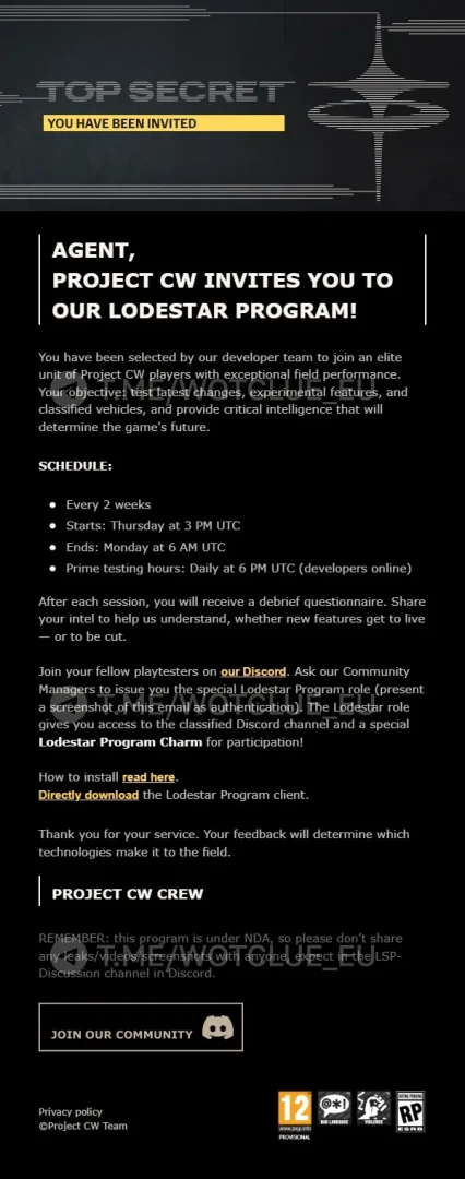 В преддверии запуска 18 супертеста (Lodestar), который пройдёт с 15 по 19 мая ОЧЕНЬ многим игрокам на этой неделе на почту прислали доступ для скачивания Lodestar-клиента. Возможно это игроки, которые подавали свои заявки на самом старте программы Lodestar, либо рандомная рассылка.