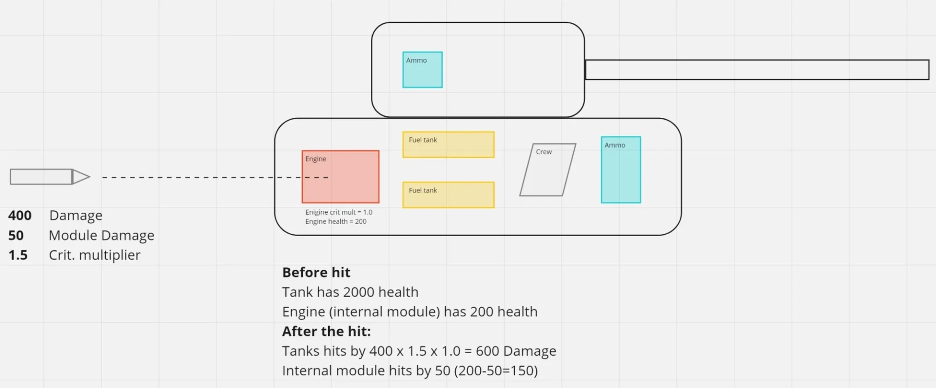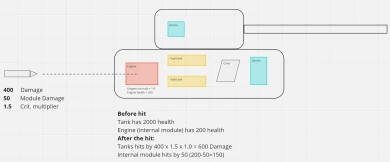 Когда снаряд попадает во внутренний модуль, его ХП уменьшается на величину атрибута повреждения модуля снаряда.