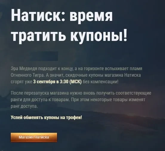 Эра медведя подходит к концу. Успей обменять купоны на награды из магазина натиска до 3 сентября. Такое сообщение поступило на полевую почту в игре.