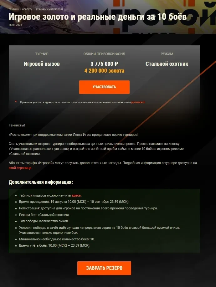 Халявный резерв Дополнительный опыт за бой (x1) можно забрать в новости про турнир от «Ростелеком».
