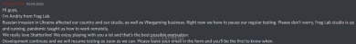 [Российская операция] на Украине повлияла на нашу страну и нашу студию, а также на бизнес Wargaming. Прямо сейчас мы должны приостановить наше регулярное тестирование. Пожалуйста, не волнуйтесь, работа студия Frag Lab отлажена, пандемия научила нас работать удаленно.