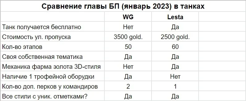 Сравнение особой главы БП (январь 2023) в танках (WG и Lesta).