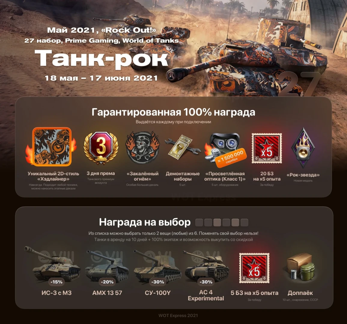 Официальные даты проведения акции для 27 майского набора Амазон/Твича «Танк-рок»: с 18 мая 20:00 (МСК) 2021 г. по 17 июня 19:59 (МСК) 2021 г.