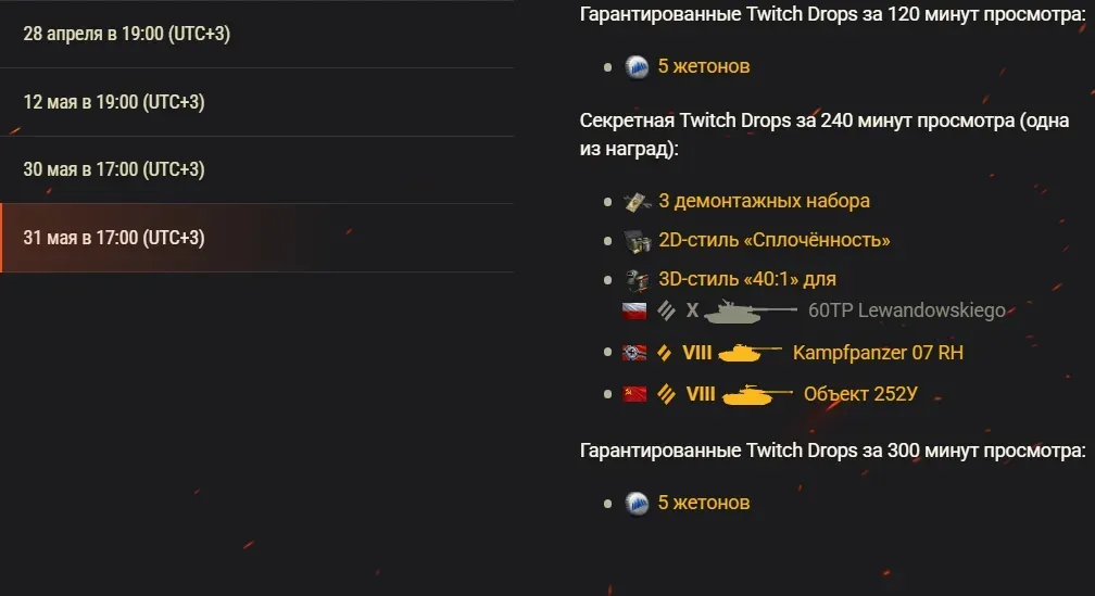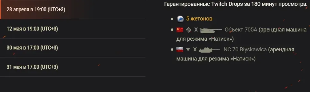 Просмотр каждой из трансляций принесёт вам гарантированные Twitch Drops с жетонами. При этом в рамках некоторых из них можно получить дополнительные награды и секретные Drops. Отмечайте даты в календаре, чтобы ничего не пропустить!