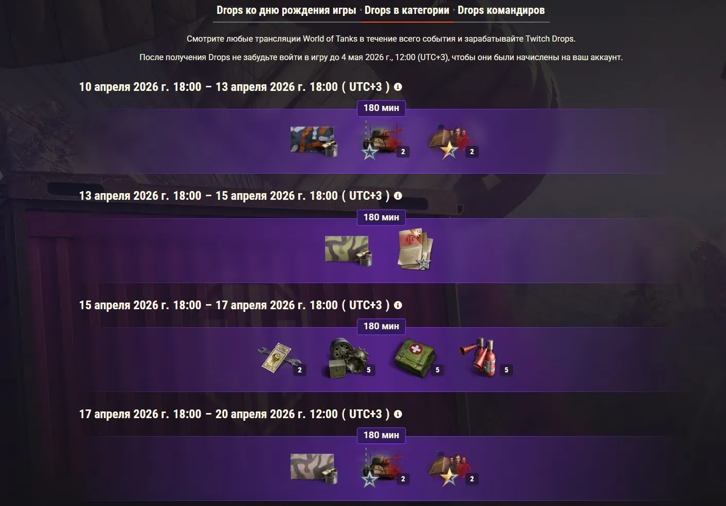 - 12 апреля 16:00 – 13 апреля 05:00 // 120 и 240 мин. // После получения Twitch Drops необходимо войти в игру до 20 апреля 2026 12:00, чтобы они были начислены на ваш аккаунт.