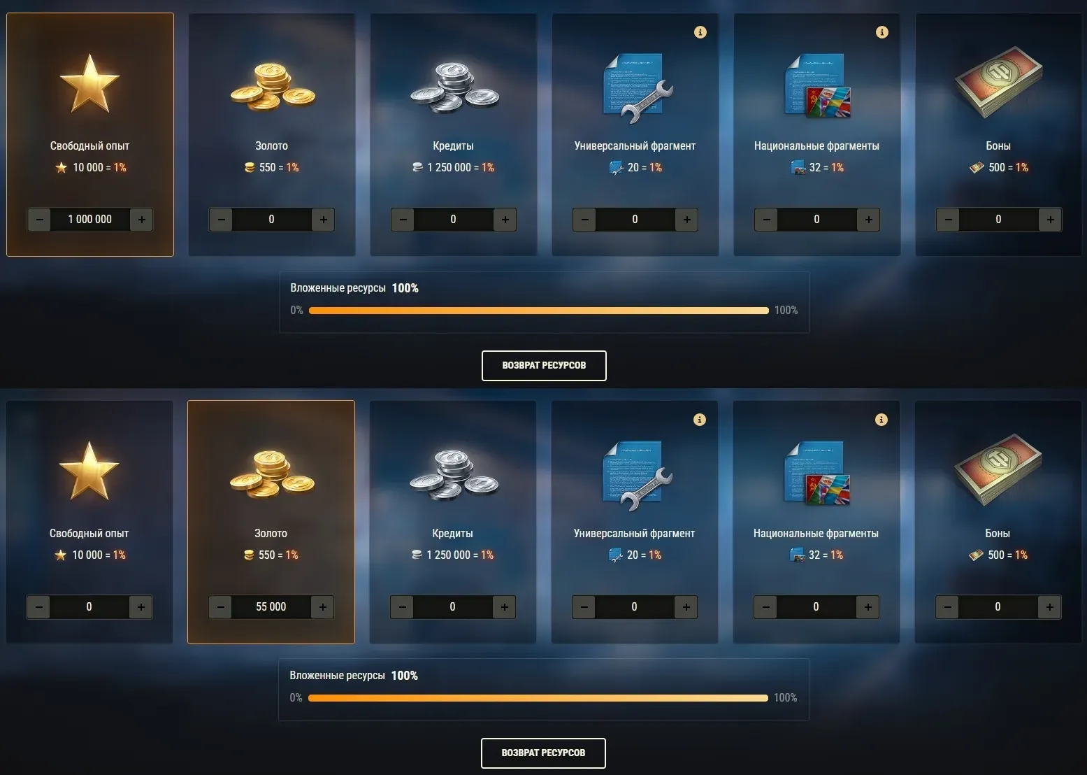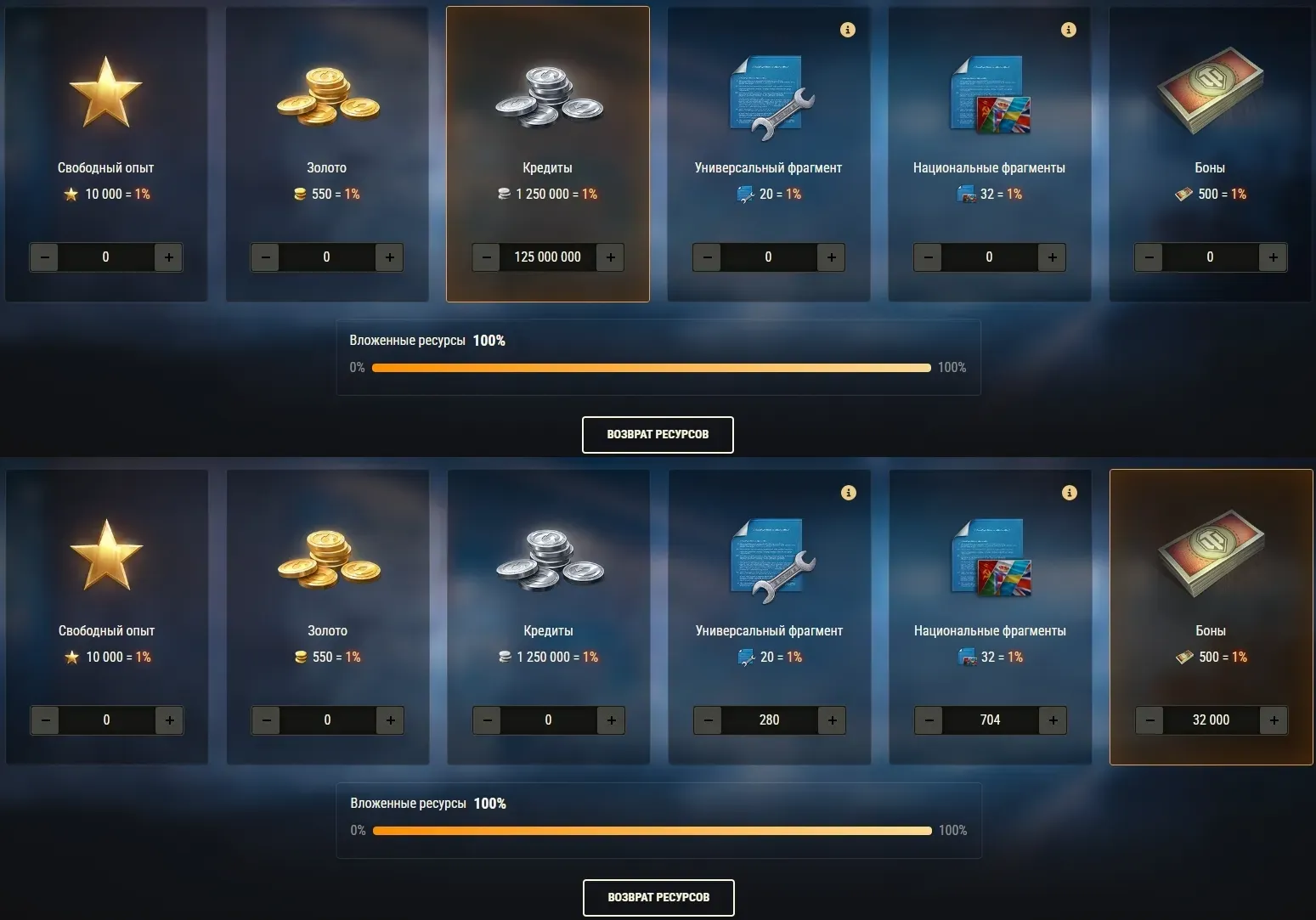 - Вкладывайте игровые ресурсы — фрагменты чертежей, свободный опыт, кредиты, золото и боны — чтобы собрать X DBV-152 и/или X Vickers MBT Mk. 3.