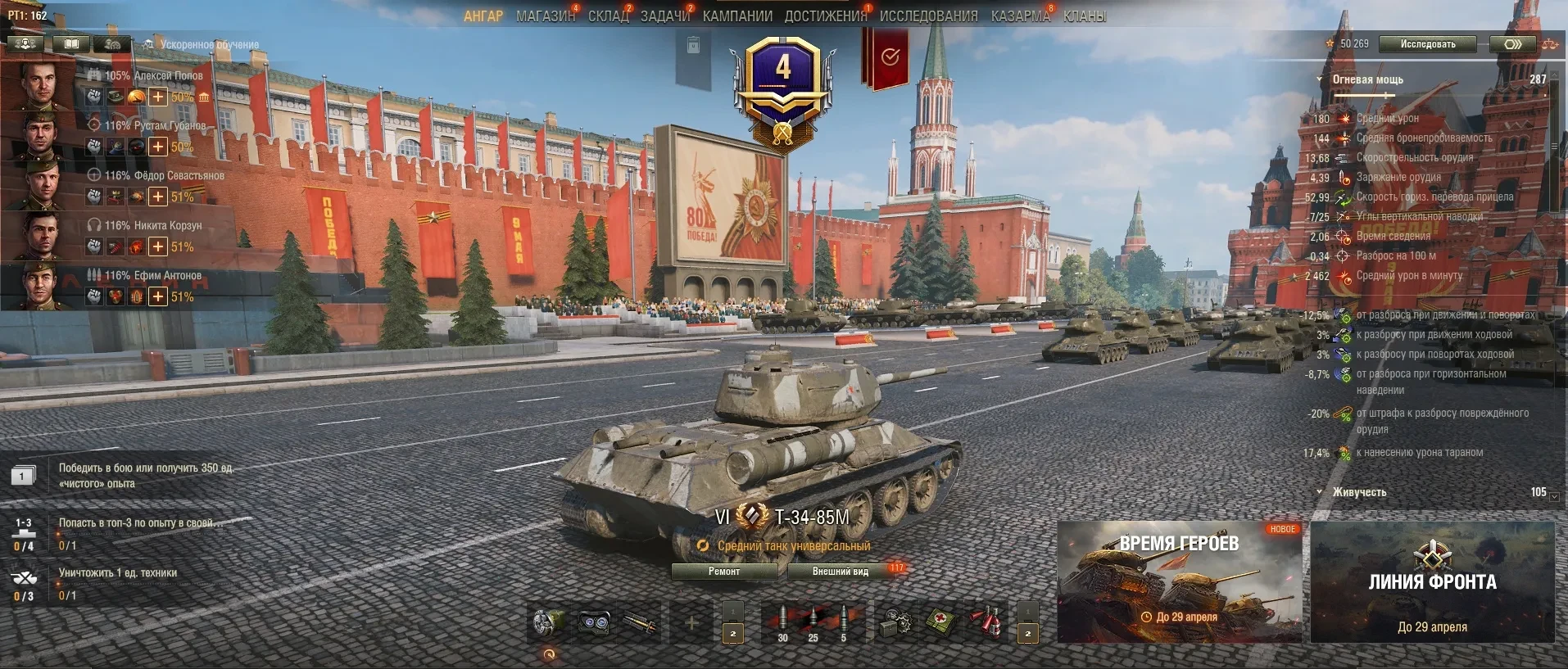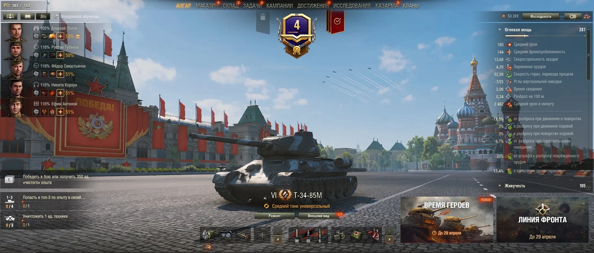 На площади можно увидеть Покровский собор и Спасскую башню. Каждая боевая машина соответствуют реальным прототипам времен Великой Отечественной войны: Т-34-85, ИС-2, ИСУ-152, Т-34, КВ-1.