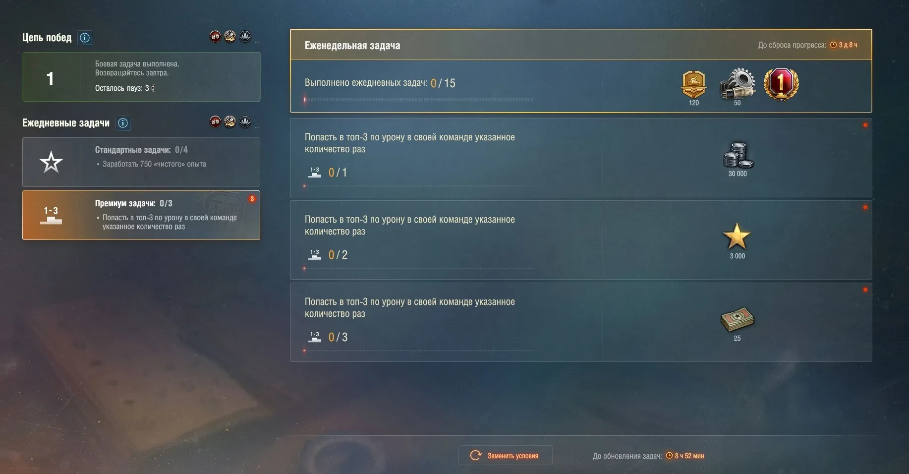 Выполнение ежедневных и еженедельных задач принесёт вам боны, кредиты, свободный опыт, случайные фрагменты чертежей, личные резервы и не только. Во время проведения Боевого пропуска вы сможете заработать очки пропуска, а с активным Премиум аккаунтом — ещё и бонусные награды.