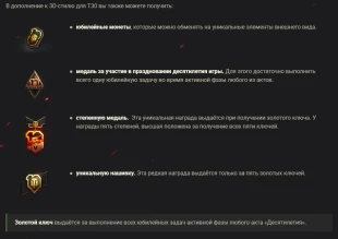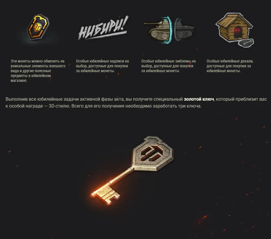 Выполнив все юбилейные задачи активной фазы акта, вы получите специальный золотой ключ, который приблизит вас к особой награде — 3D-стилю. Всего для его получения необходимо заработать три ключа.