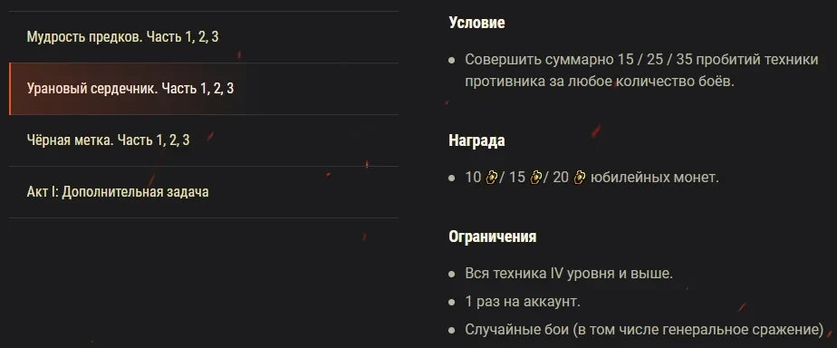 В каждом акте во время активной фазы и затишья вам будут доступны специальные юбилейные задачи, которые вы сможете выполнять в случайных боях на любой технике IV уровня и выше. За их выполнение вы получите специальную валюту «Десятилетия» — юбилейные монеты, которые можно будет обменять на уникальные элементы внешнего вида и другие полезные предметы во внутриигровом юбилейном магазине.